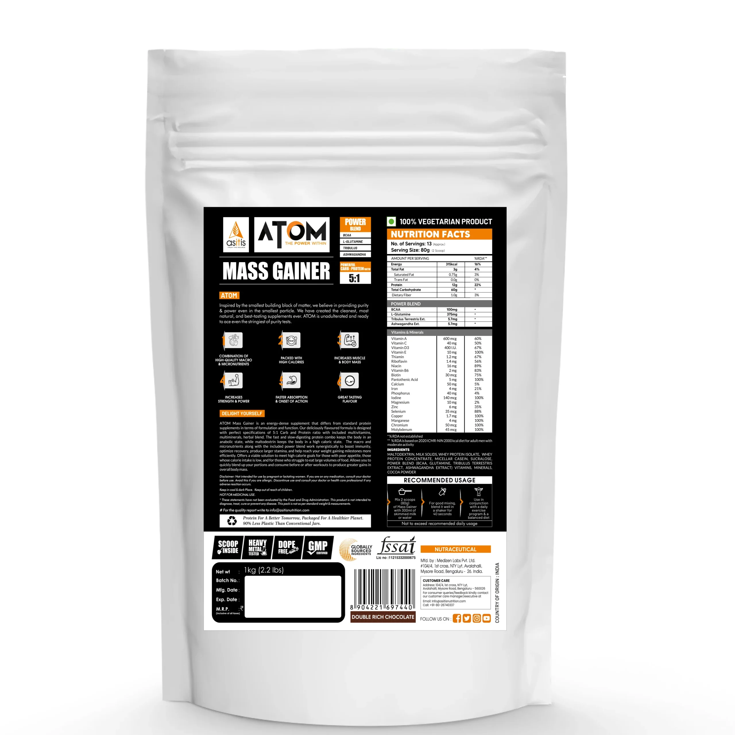 ATOM Mass Gainer is an energy-dense vegetarian supplement that is free of banned substances, cheap fillers, soy, and preservatives. One serving of the mass gainer provides you with 315Kcal, 12g protein, 60g carb, and power blend which includes BCAA, L-Glutamine, Tribulus, Ashwagandha extract. The supplement comes in an exotic double-rich chocolate flavour with an included enzyme blend to facilitate easy digestion and assimilation of the nutrients. The supplement is manufactured in a GMP-certified facility, it is 3 rd party lab-tested and comes with a unique authentication method to verify the authenticity of the product.