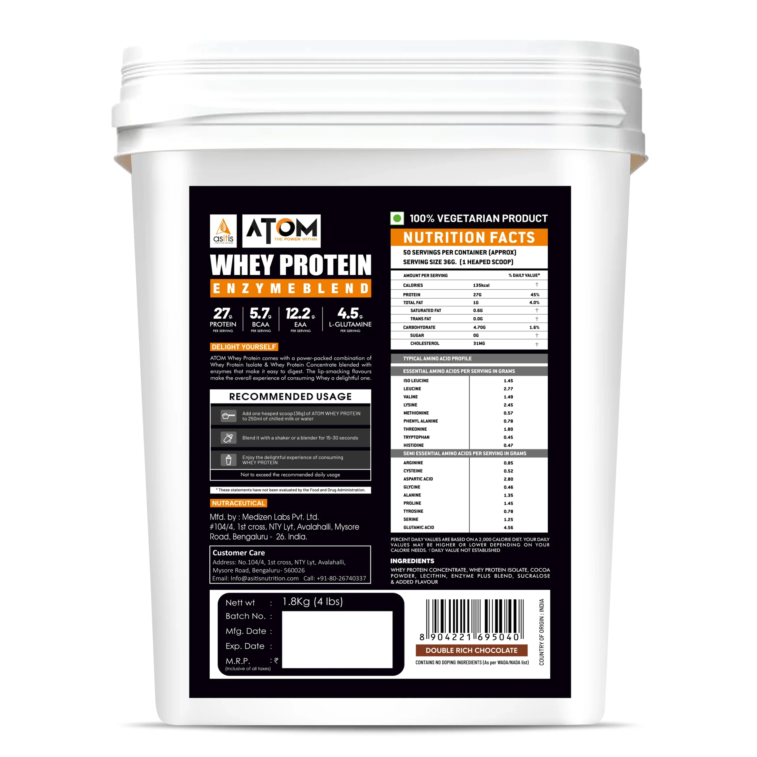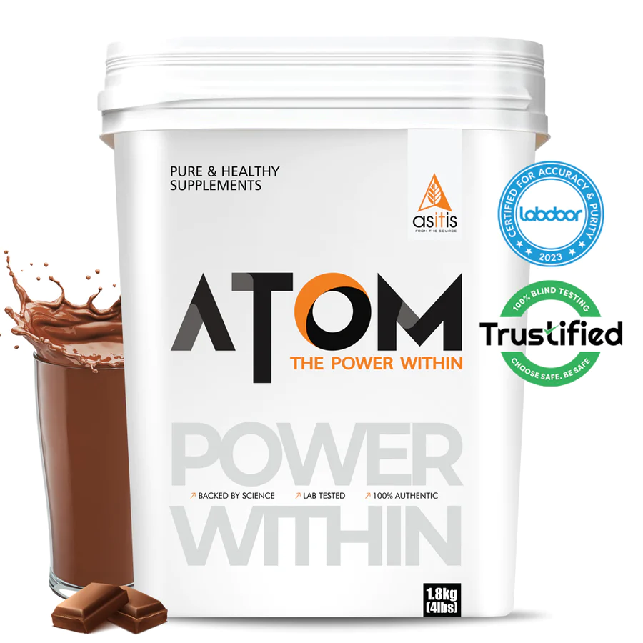 Whey is a dairy-based protein supplement produced during the process of making cheese. The fast-digesting, quick and convenient Whey Protein offers an incredible range of amino acids and is considered to be the highest quality protein supplement due to its highest biological value. Whey Protein is versatile, has the highest leucine content among protein sources, is a complete protein that contains all 9 essential amino acids, offers the highest protein per serving, promotes satiety, and quickly enhances muscle recovery. ATOM Whey Protein includes the best ever blend of Whey Protein Concentrate and Whey Protein Isolate with an included enzyme blend that facilitates in faster assimilation of Whey. ATOM Whey is manufactured in a GMP-certified unit, undergoes 3rd party lab-testing, and comes with 2-step authentication.