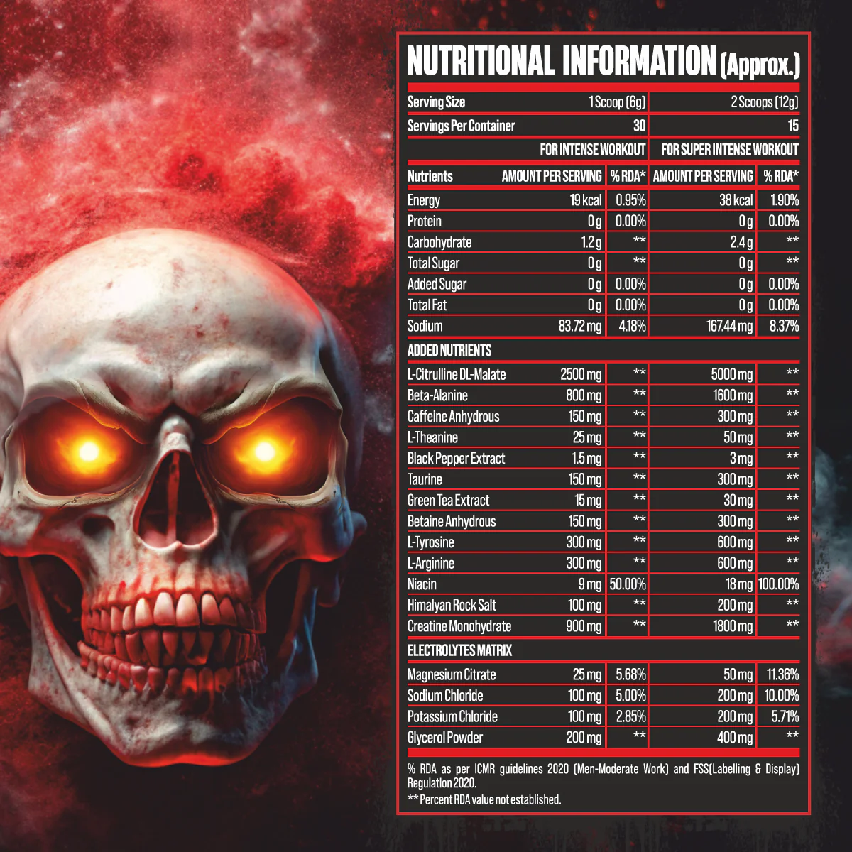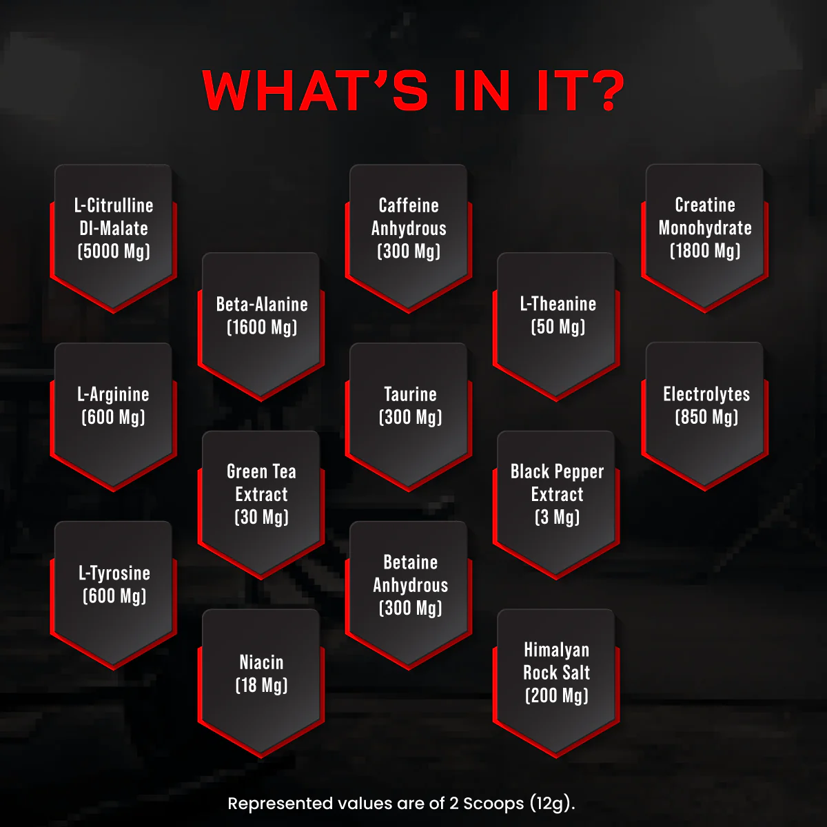 ARGININE ALPHA KETO GLUTERATE, BETA-ALANINE, GLUTAMINE, CREATINE NITRATE, L-TYROSINE, L-TAURINE, THEACRINE, ANTI CAKING, SUCRALOSE, CITRIC ACID.