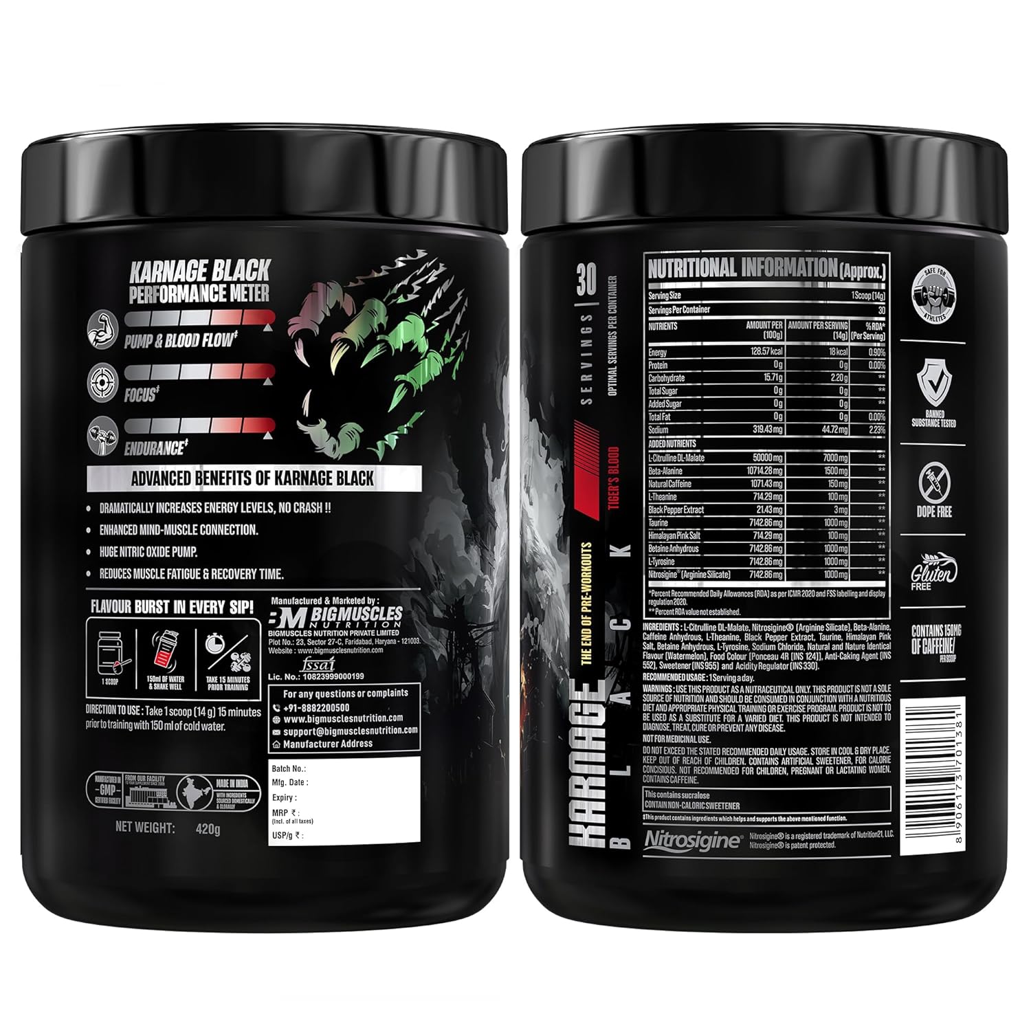 Bigmuscles Nutrition Karnage Black Pre Workout is an ultra-high energy pre-workout, which packs a potent 14g serving.