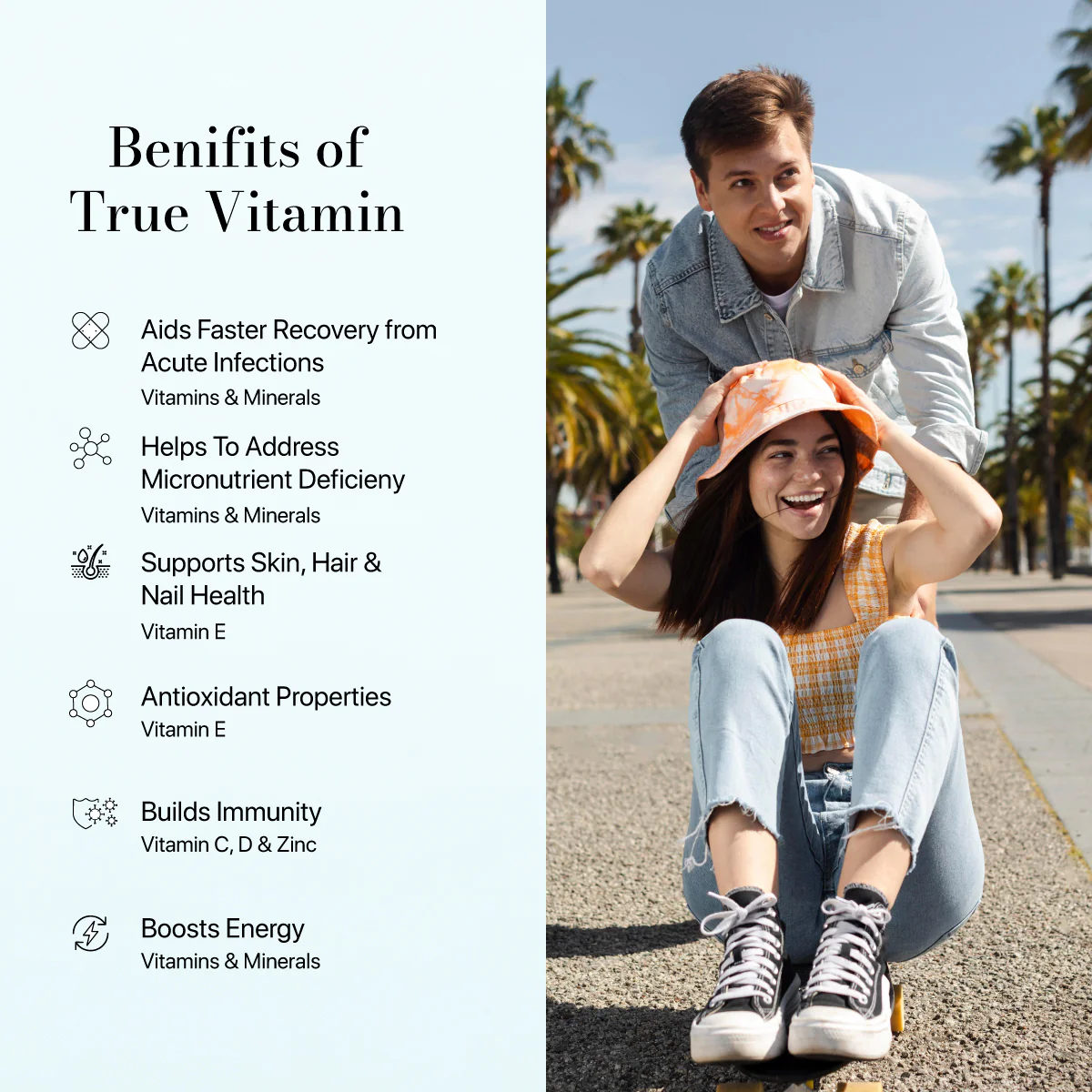 BM Wellness True Vitamin Multivitamin is a complete multivitamin and mineral formula designed to improve and enhance overall wellness. It is enriched with probiotics which ensures better digestion, nutrient absorption, and gut health making it a perfect addition to your daily routine.