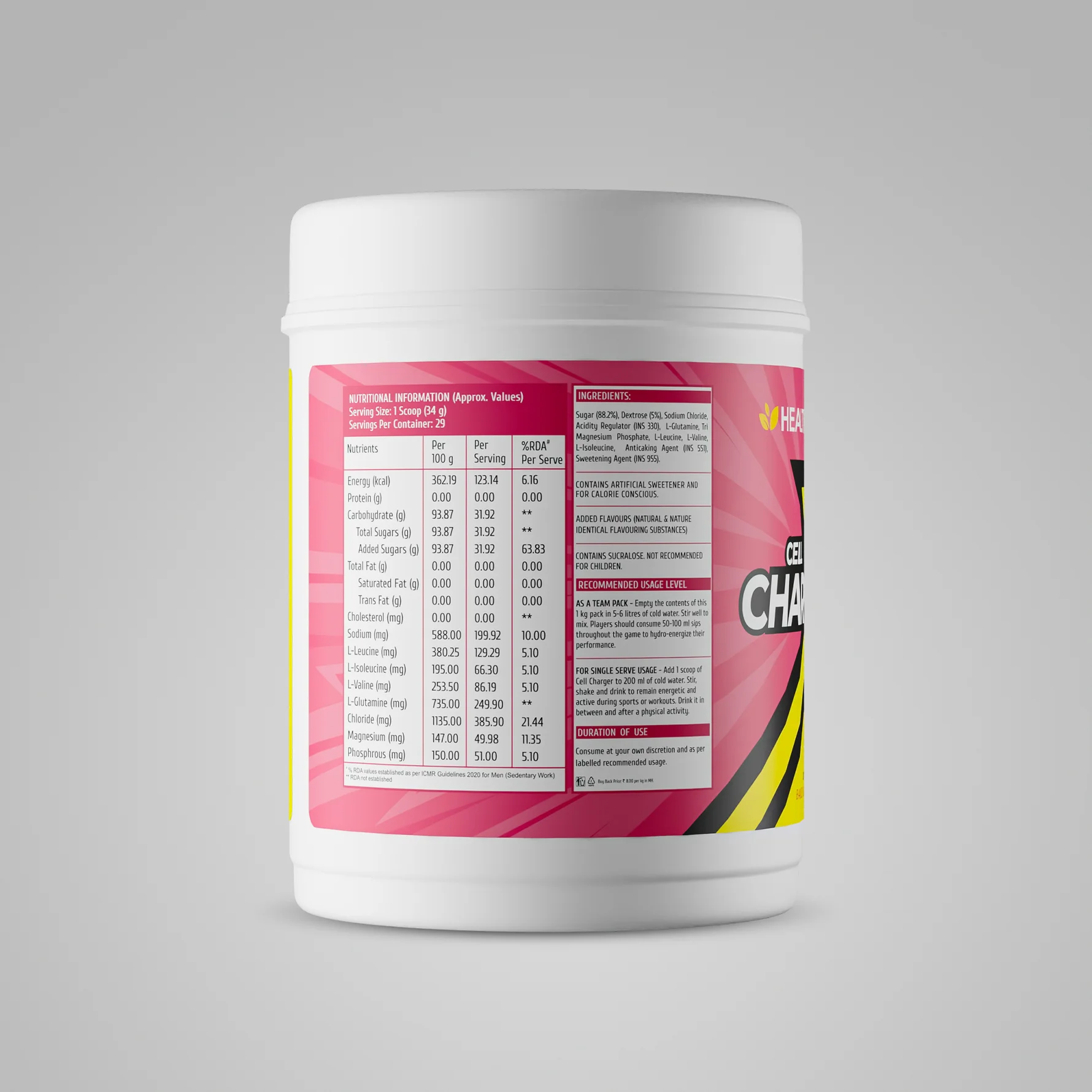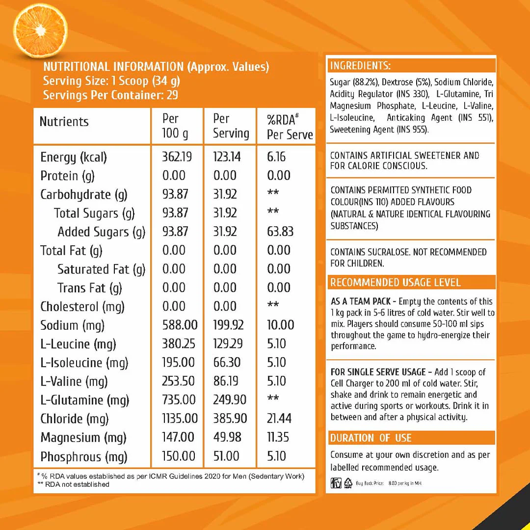 Add 1 scoop of Cell Charger to 200ml of cold water. Stir, shake and drink to remain energetic and active during sports and workouts. Drink it in between and after a physical activity.