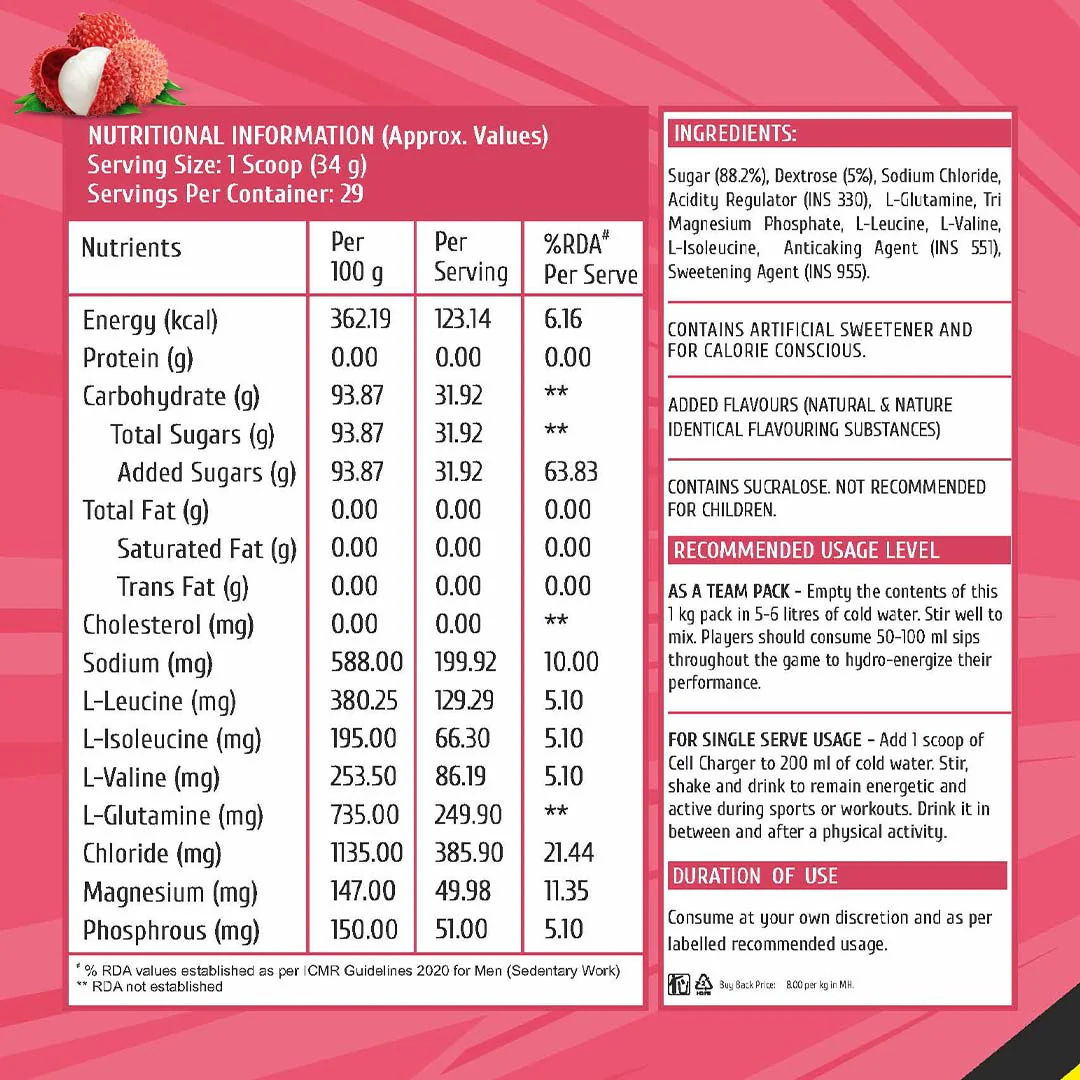 Introducing Cell Charger – your go-to instant energy booster pack with essential BCAAs (281mg) and Glutamine (250mg). Whether you’re an athlete, fitness enthusiast, or just need a quick pick-me-up, Cell Charger is here to fuel your performance. Say goodbye to fatigue and hello to endurance with our specially crafted blend designed to prevent cramps and restore electrolyte balance during intense workouts. Not only does Cell Charger support muscle growth and energy transfer, but it also strengthens your immunity, keeping you protected against illnesses. With its easy digestion and safe formulation, Cell Charger is suitable for all ages. Plus, enjoy the refreshing burst of fruity flavours including Fruit Punch, Strawberry Ice, Green Apple, and more.