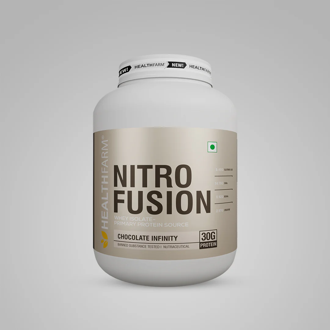• The whey protein in Healthfarm Nitrofusion is sourced primarily from whey isolates-cleanest and purest protein sources available. Using these proteins on a daily basis is vital in helping to increase muscle protein synthesis for more muscle size and strength.