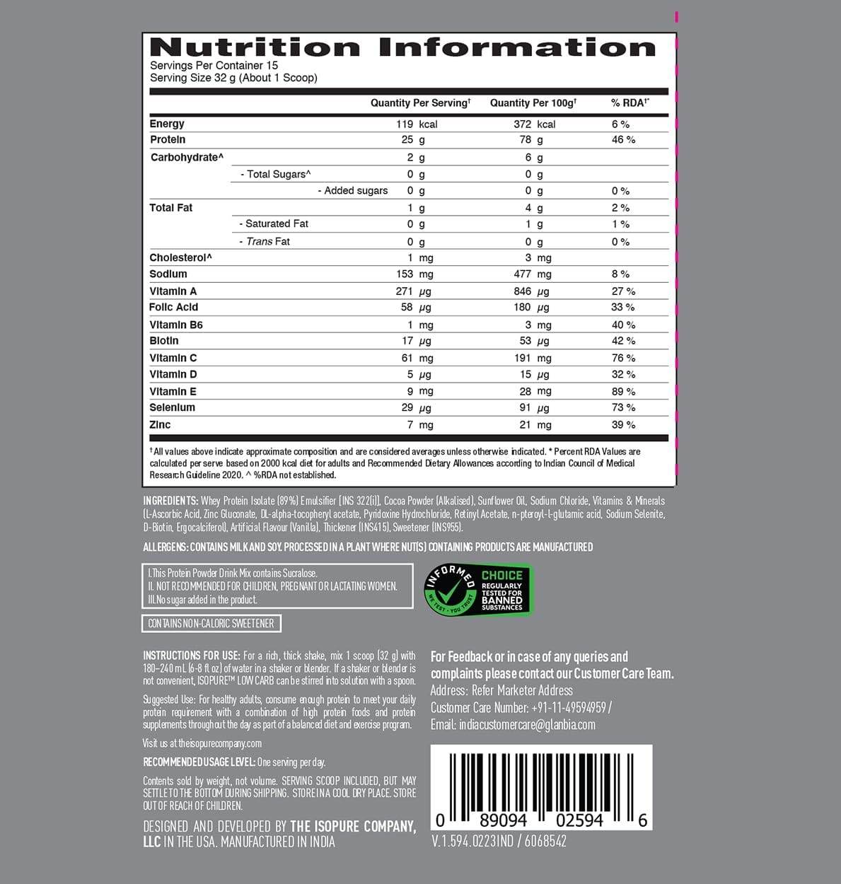 Pack in powerfully 25gm pure protein per scoop, without packing on the carbs. Our 100% whey protein isolate powders amp you up, without any unwanted weight. It’s 100% whey protein isolate loaded with vitamins, minerals and nutrients to keep you going strong—and always without gluten, lactose, or any impurities. Made with our complete microfiltration process, it is the only completely clear milk protein when dissolved in water. Not a significant source of saturated fat, trans fat, dietary fiber, total sugars, added sugars, vitamin D and iron.