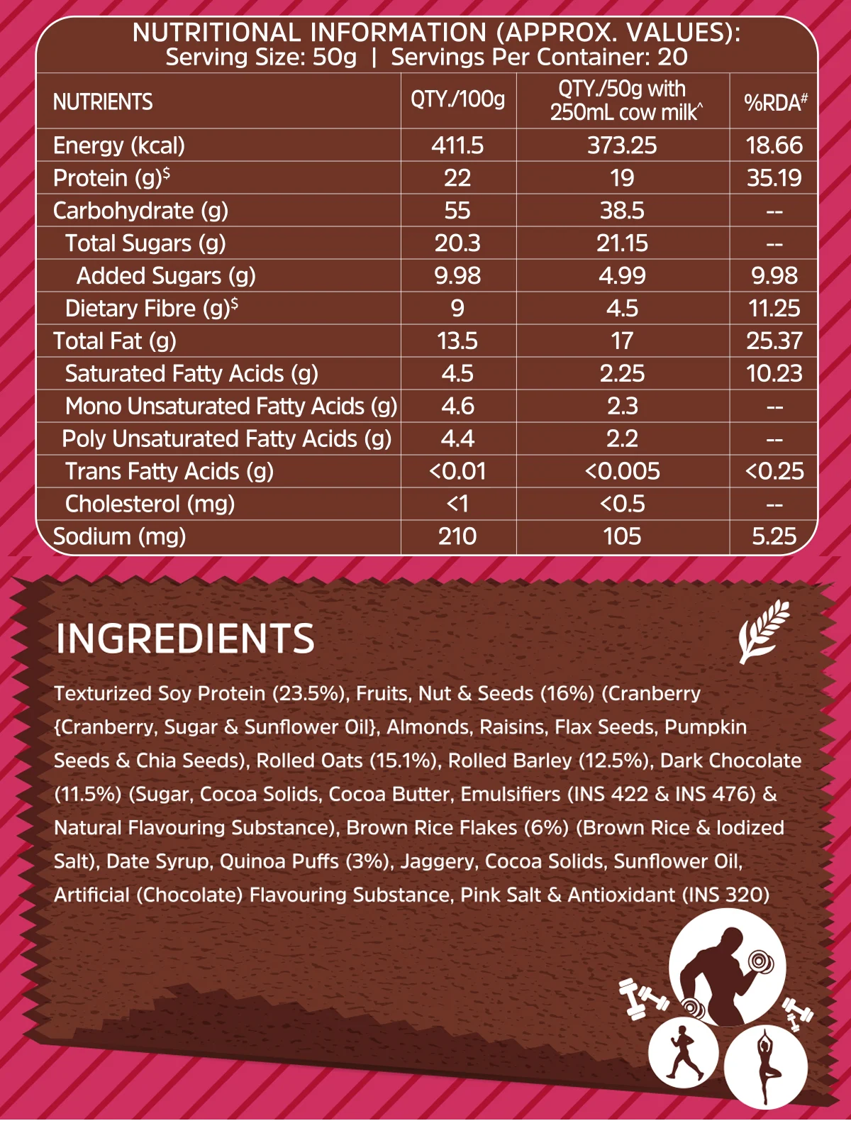 Make your mornings efficient & nutritious with this quick breakfast muesli. Mix 50 mg muesli with 250 ml skimmed milk, hot or cold & your breakfast is ready. Enjoy the artful blend of dark chocolate and cranberries that will awaken your senses. Your healthy muesli is already loaded with nutrients but you can add fresh fruits or dry fruits for an upgrade in nutrition.