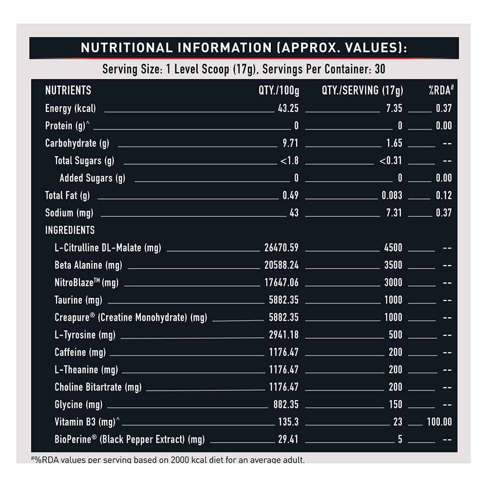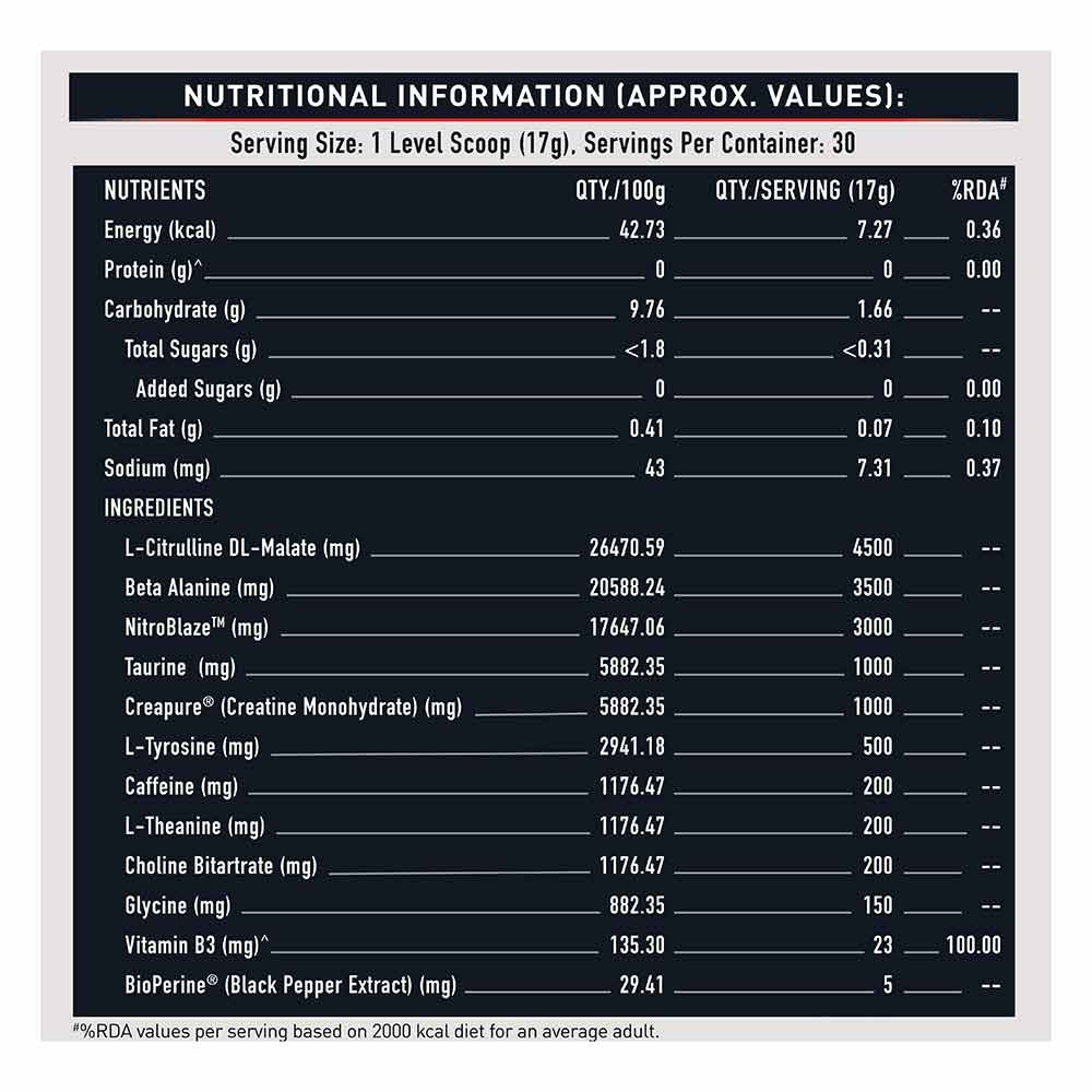 5 mg BioPerine provides thermogenesis that results in advanced absorption of nutrients & fat metabolism. MuscleBlaze WrathX pre workout supplement also contains premium quality creatine monohydrate for strength & lean muscle gains.