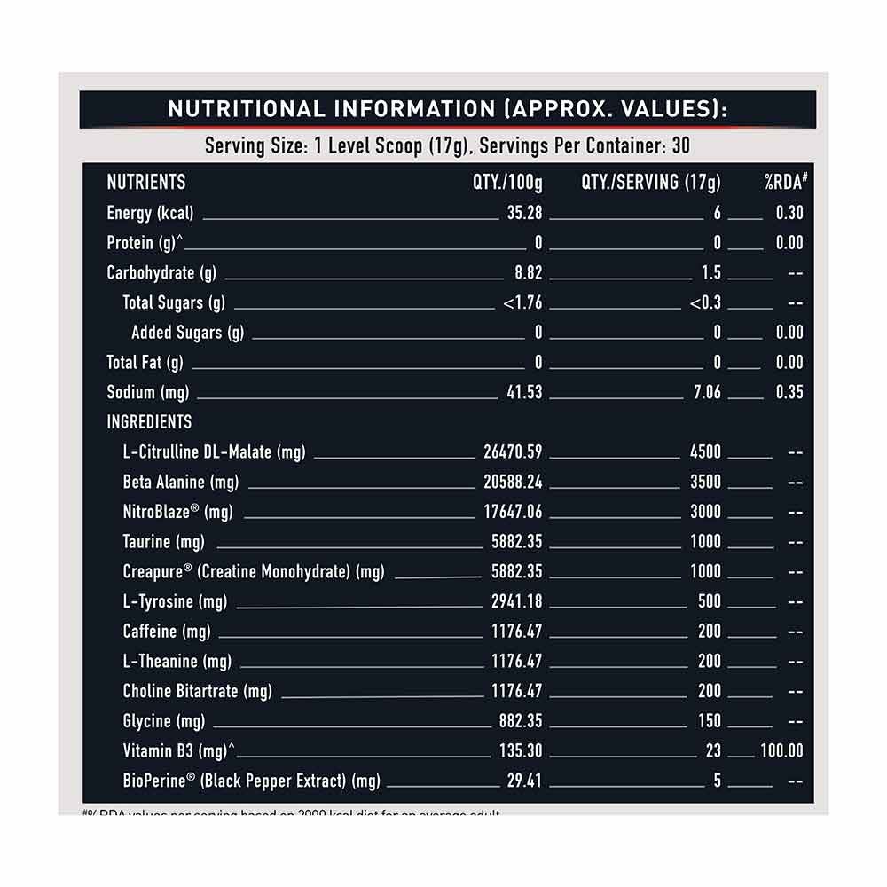 Take your workouts to the next level with MuscleBlaze WrathX. Beta-Alanine, Creatine Monohydrate, Caffeine & potent blends help reduce muscle soreness and fatigue and keep you charged to push through your workouts.