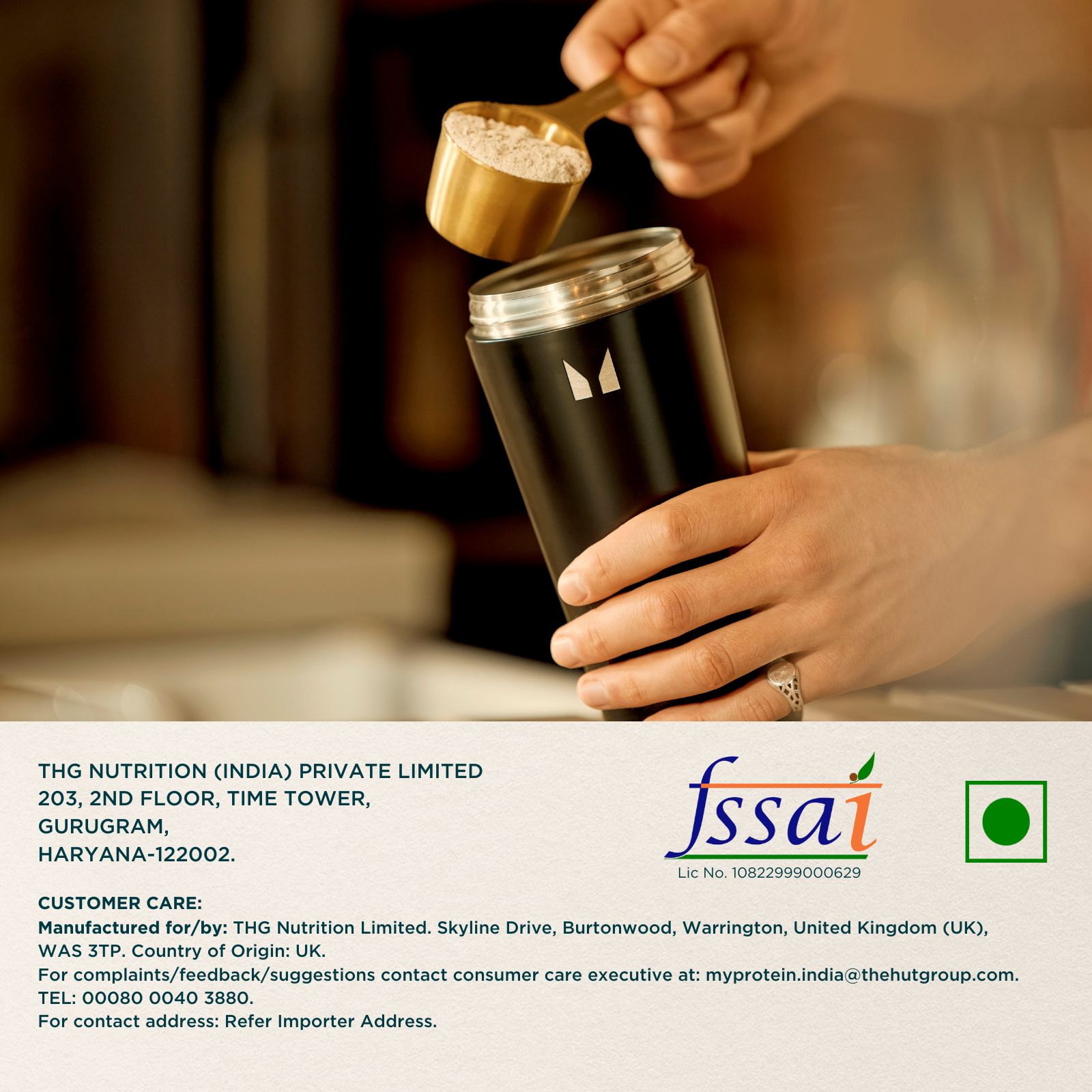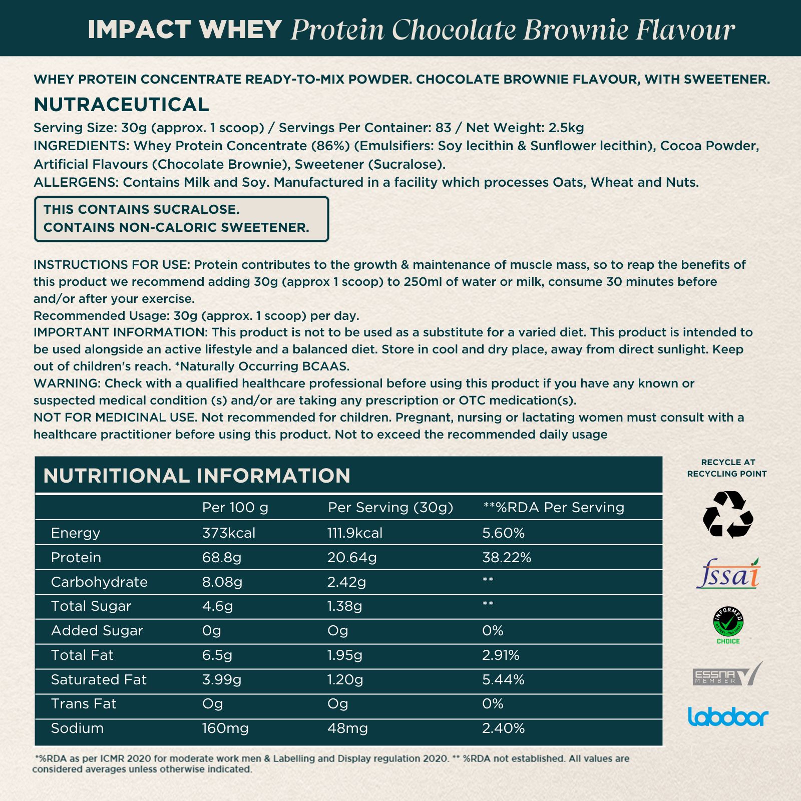 Whey Protein Concentrate (Milk) (96.3%), Emulsifier (Soy and Sunflower Lecithin), Flavouring, Sweetener (Sucralose). CONTAINS ARTIFICIAL FLAVOURING SUBSTANCE (Thandai Flavour).