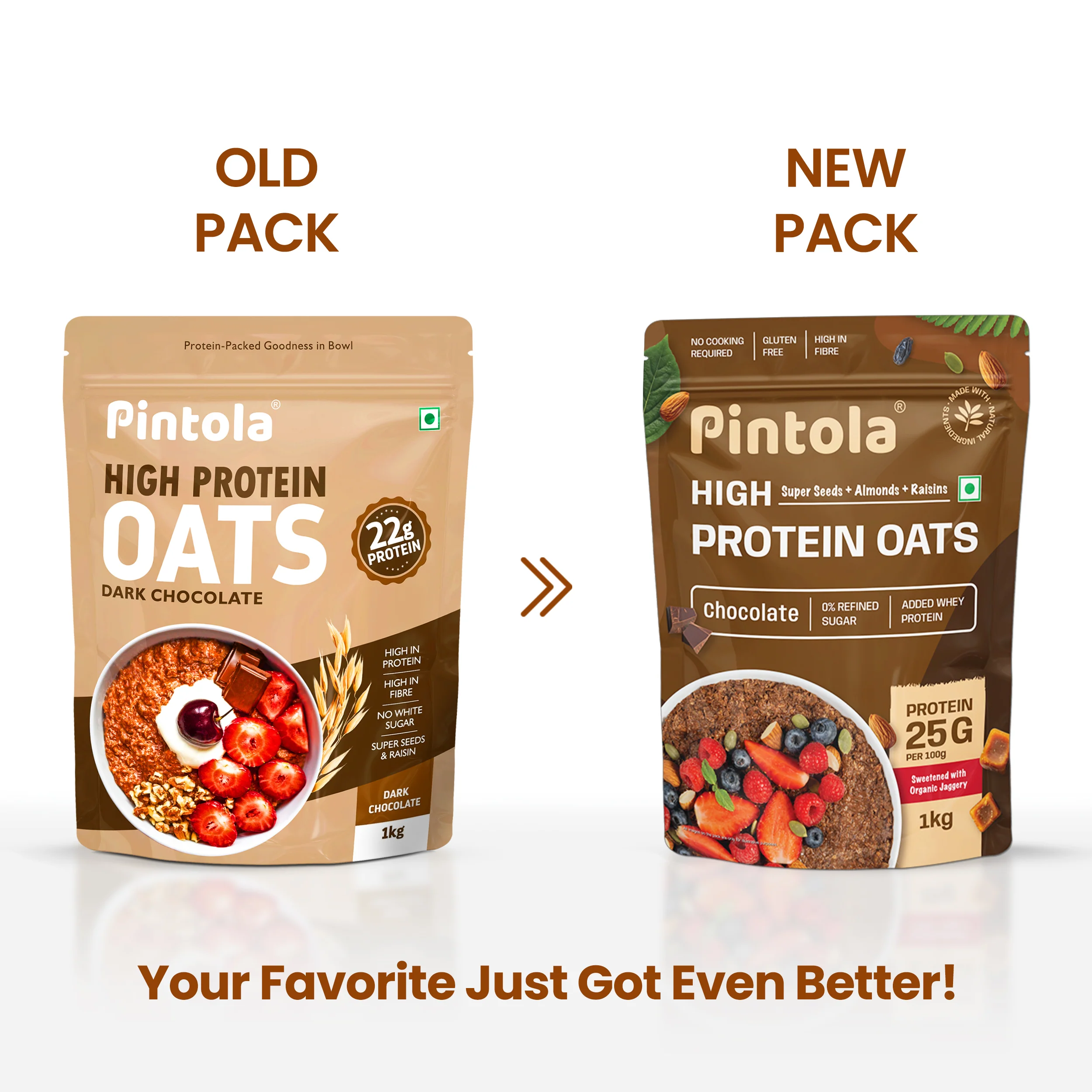 • Pintola High Protein Oats Dark Chocolate flavour, boast a substantial 22g of protein per serving, making every spoonful a step towards sustained energy and fullness.