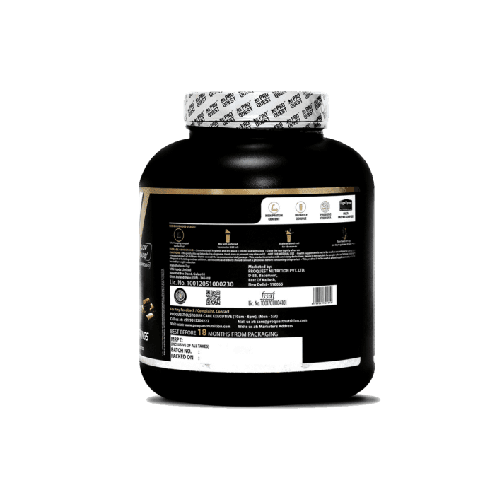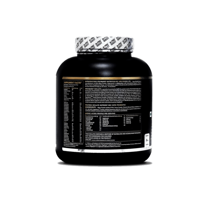 Proquest Isolate Protein is manufactured using Whey from United States .Proquest Whey Protein Isolate is a low carb and very low fat formula, providing 27.7g of protein per scoop(33 g). Each serving (33g) comes loaded with 7g of BCAA, 4.6g of Glutamine & Glutamic acid for quick recovery ,26 essential vitamins and Minerals release optimum and steady amounts of protein for bodybuilding ,enriched with probiotic boost immunity and DigeZyme® , a multi-enzyme blend helps in digestion & absorption of protein, carbs & fat in the body .