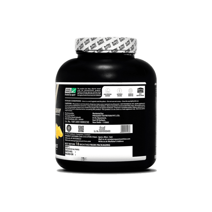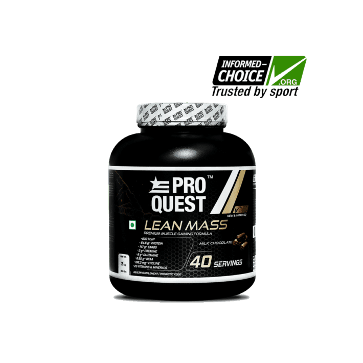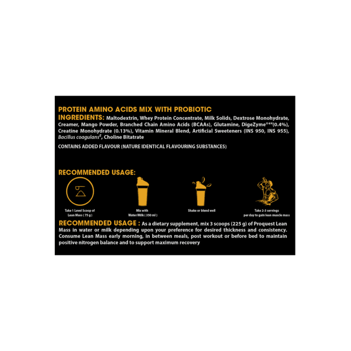 Proquest Lean Mass gainer combine protein, essential amino acids,carbohydrates and micronutrients to drive your body to increase on desired added size . Lean Mass , the premium high protein muscle gaining formula 3 Level Scoops (225g) provides 936 Kcal, 54.6g of fast and slow digesting protein, 147g carbohydrate , 3g Creatine Monohydrate ,6g of Glutamine & Glutamic Acids & 8.85g BCAA’s for muscle protein synthesis .Enriched with 186.3mg of Choline helps to boost the cognitive performance and protect the brain from degeneration and over 25 vitamin and minerals improves focus , stamina , strength & reduce fatigue .Combination of Bacillus coagulans probiotic and DigeZyme -A Multi-Enzyme-Complex, which supports protein utilisation ,proper digestion & absorption of macro & micronutrients. Digezyme is a registered trademark of Sabinsa Corporation