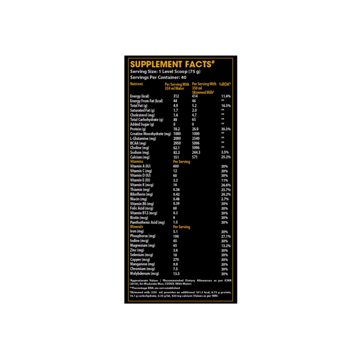 • Recommended serving of Lean Mass 3 Level Scoops (225g) per day provides : • 936 kcal of energy and has been designed to help build lean quality muscle mass • 54.6g of fast and slow digesting protein and 147g slow & fast digesting carbohydrates provides ustained energy • 3g Creatine Monohydrate to help your muscles produce energy for exercise • 6g of Glutamine & Glutamic Acids an important amino acid for maintaining positive immune response and muscle function to support wellness goals • 8.85g BCAA for muscle recovery and growth