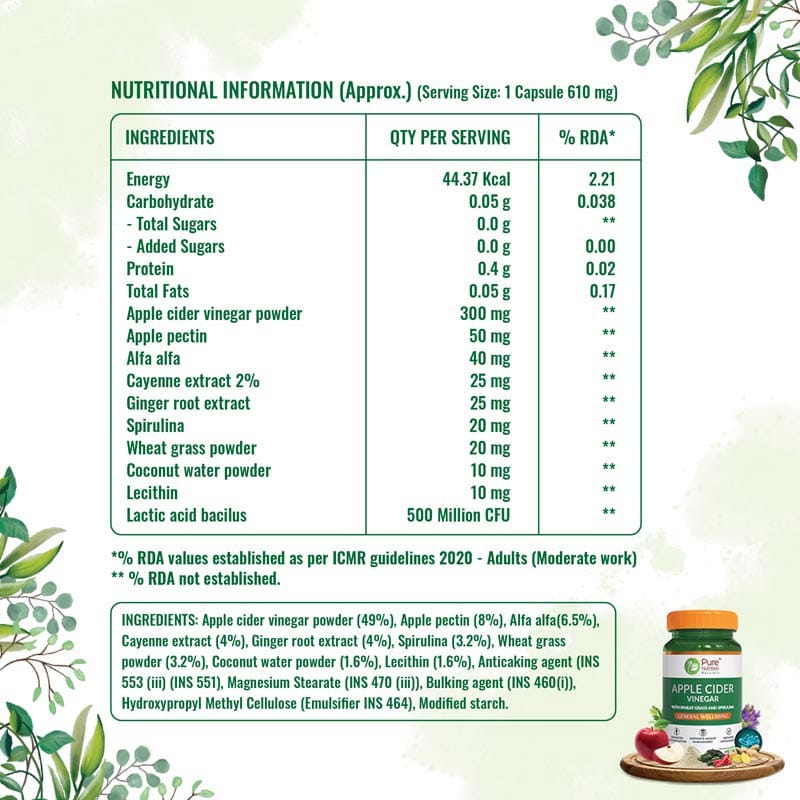 Pure Nutrition Apple Cider Vinger Plus contain prebiotic apple pectin that assists in maintaining gut health and smooth functioning of the bowel. It contains natural ingredients like alfalfa, cayenne extract, ginger root extract, spirulina, and wheatgrass, which are potent antioxidants that encourage detoxification and help boost the immune system. Enriched with probiotic lactic acid bacillus, these capsules help maintain healthy gut flora and support the smooth functioning of the digestive tract. Men and Women can consume Pure Nutrition Apple Cider Vinegar capsules for weight loss and metabolism boost.