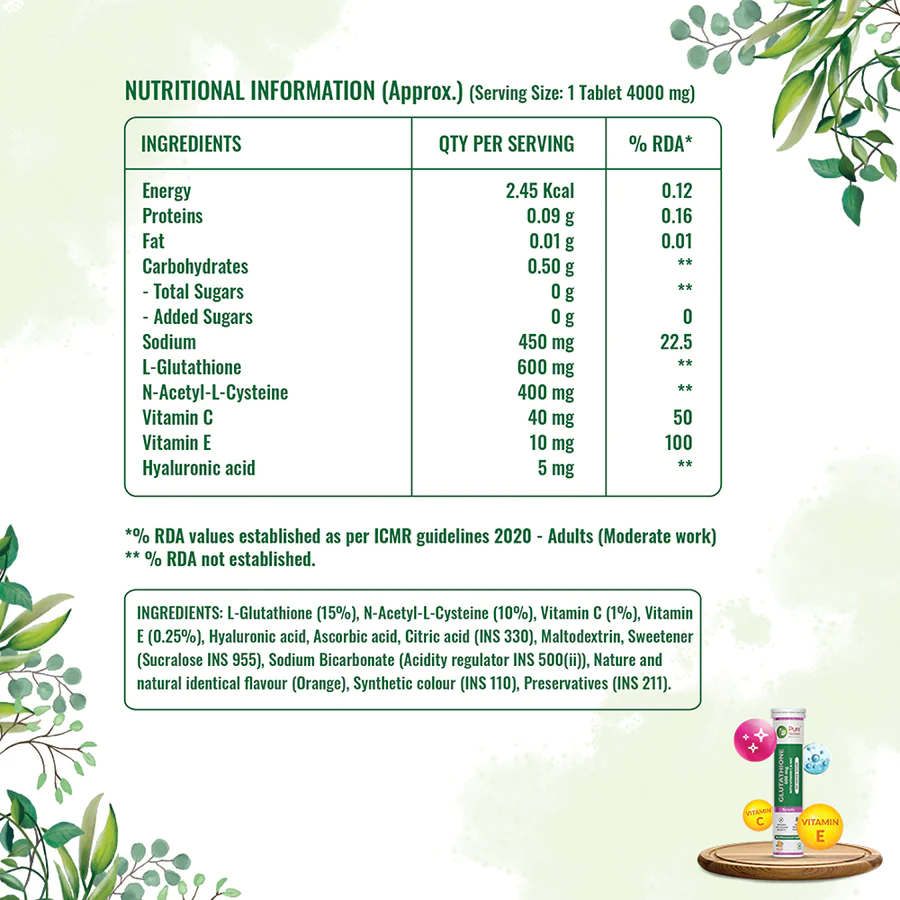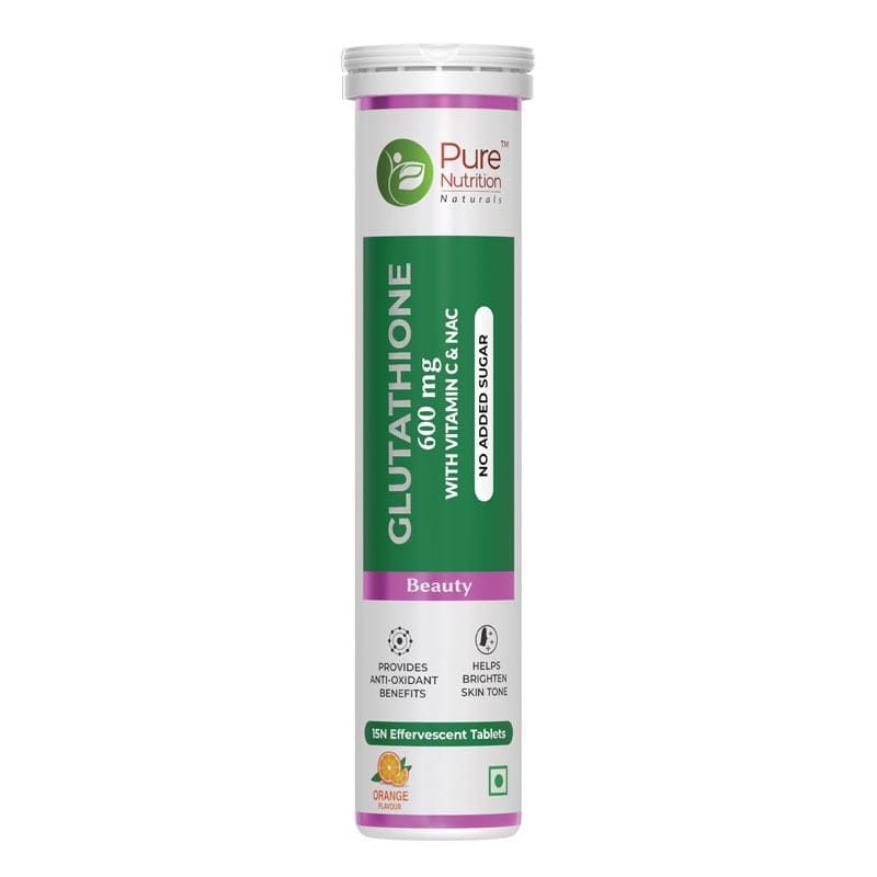 Pure Nutrition Glutathione 15 Tablets Effervescent consists of glutathione tablets enriched with Vitamin C and NAC. This glutathione supplement is high in antioxidants that prevent cellular damage from free radicals. It helps manage melanin production in the body, which results in healthy, radiant, and glowing skin. This fizzy supplement consists of L-glutathione, which helps brighten the skin by enhancing pheomelanin synthesis. It also guards the skin against harmful UV rays and helps in increasing skin luminosity and clarity. It inhibits tyrosinase activity that reduces the concentration of eumelanin, responsible for skin dullness. The supplement also helps improve liver function in people suffering from alcoholic or non-alcoholic fatty liver disease. The supplement consists of vitamin C & NAC that help boost the natural synthesis of Glutathione in our body, thus enhancing immunity and bioavailability. Pure Nutrition Glutathione supplement not only serves as glutathione tablets for skin whitening but also supports skin health and provides antioxidant & anti-inflammatory properties to boost overall health. The supplement comes in a unique effervescent tablet form that is easy to dissolve. It does not contain any added sugar.