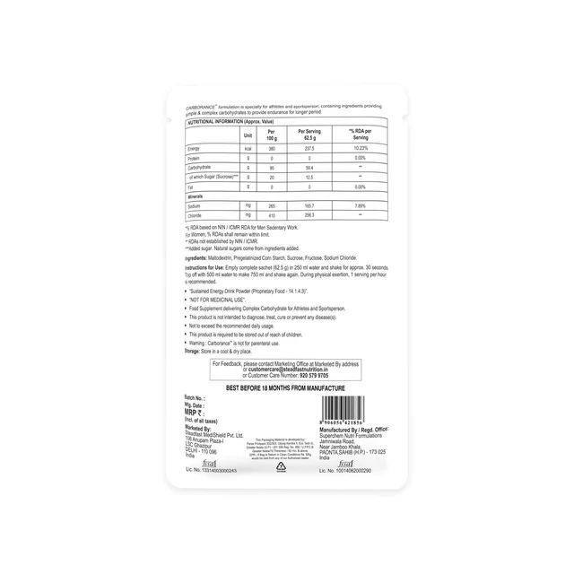 An athlete or fitness enthusiast should take Carborance depending on their sport, training intensity, and lifestyle. If you want to boost energy during a workout or intense activity, take one serving of Carborance every hour or as a dietician recommends. Others should maintain the dosage depending on their daily meal intake, lifestyle, and activity level.