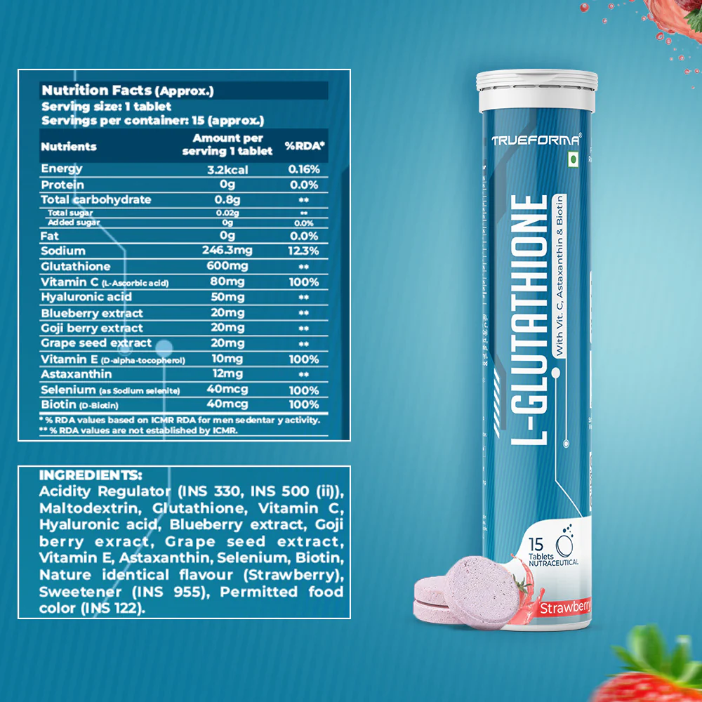 Trueforma L-Glutathione Effervescent Tablets are a premium nutraceutical formulation combining L-Glutathione, Vitamin C, and Astaxanthin—a powerful trio of antioxidants that help support skin radiance, detoxification, and cellular protection. Enhanced with Hyaluronic Acid, Grape Seed, Blueberry, and Goji Berry Extracts, this advanced formula promotes inner glow and overall wellness from within.