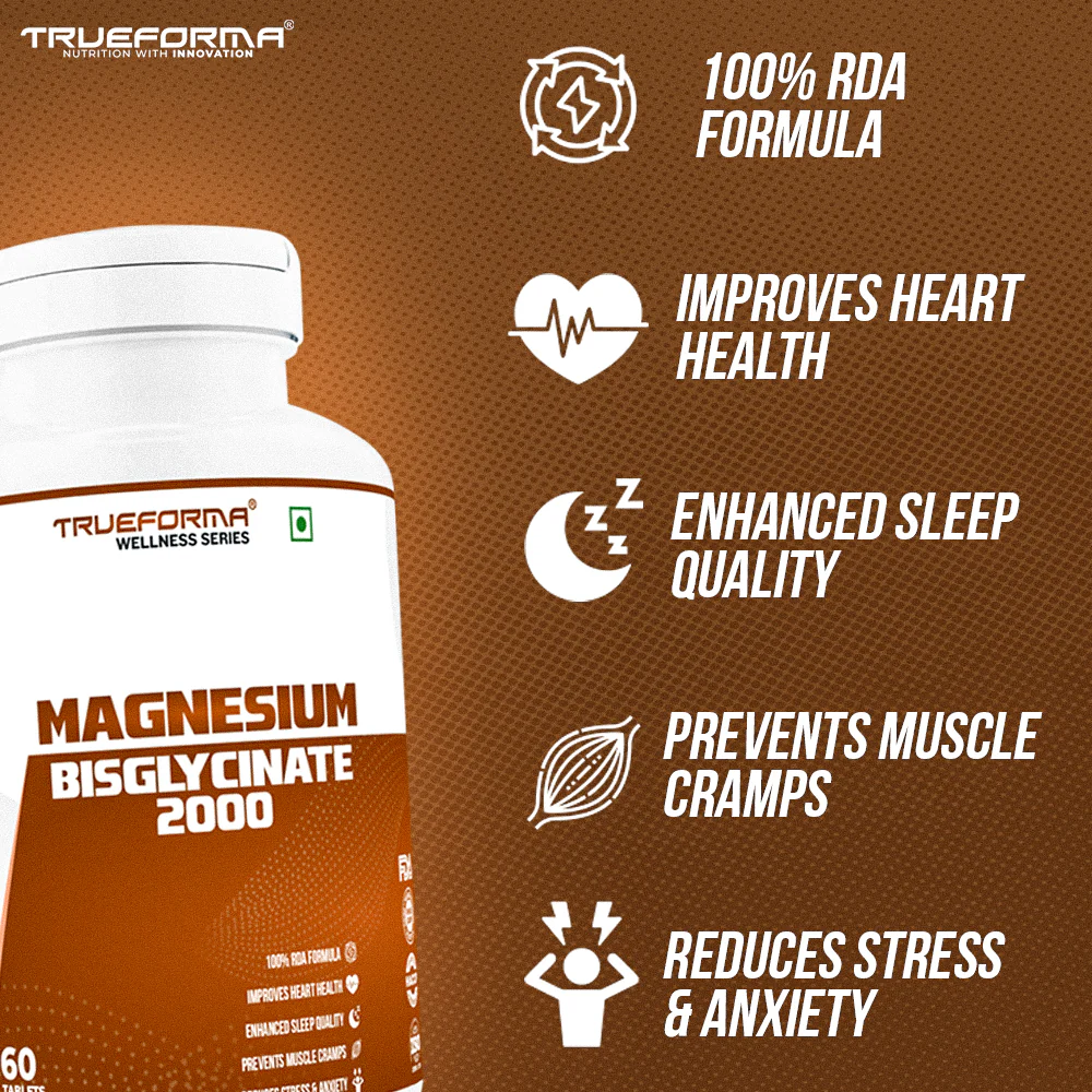 Trueforma Magnesium Bisglycinate 2000 is a tablet-based dietary supplement that contains magnesium in bisglycinate form. It is intended for individuals who prefer including magnesium supplements as part of their daily nutrition routine.