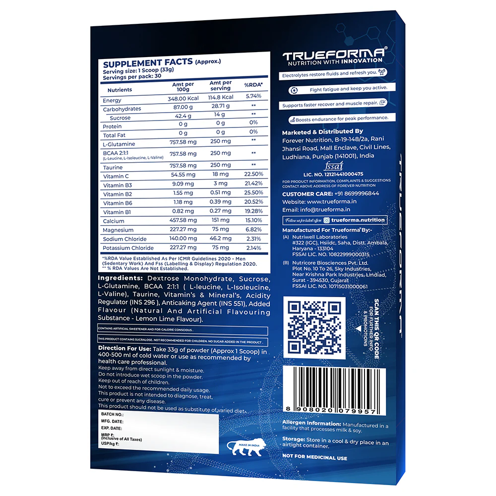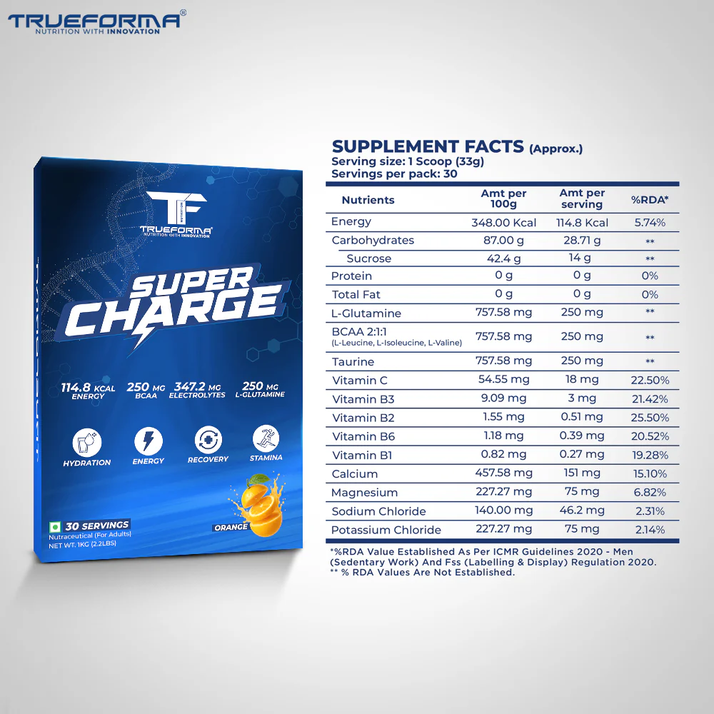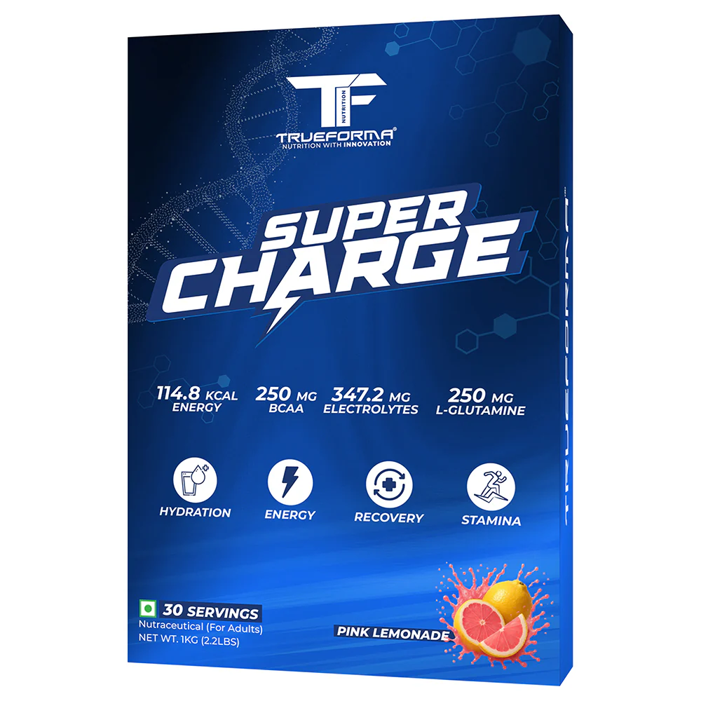 Trueforma Super Charge Energy Drink is your ultimate intra-workout fuel, crafted to keep you energized, hydrated, and performing at your peak. Packed with a powerful blend of electrolytes, BCAAs, glutamine, and glucose, it supports faster recovery, boosts stamina, and helps you push through every rep with consistent intensity.