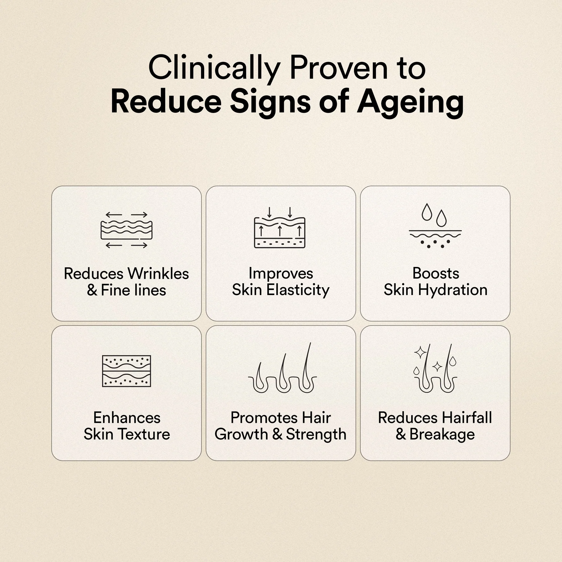 Enriched with clinically proven ingredients including Vitamin C & E, to support collagen production and improve skin elasticity, hair strength, and overall skin texture