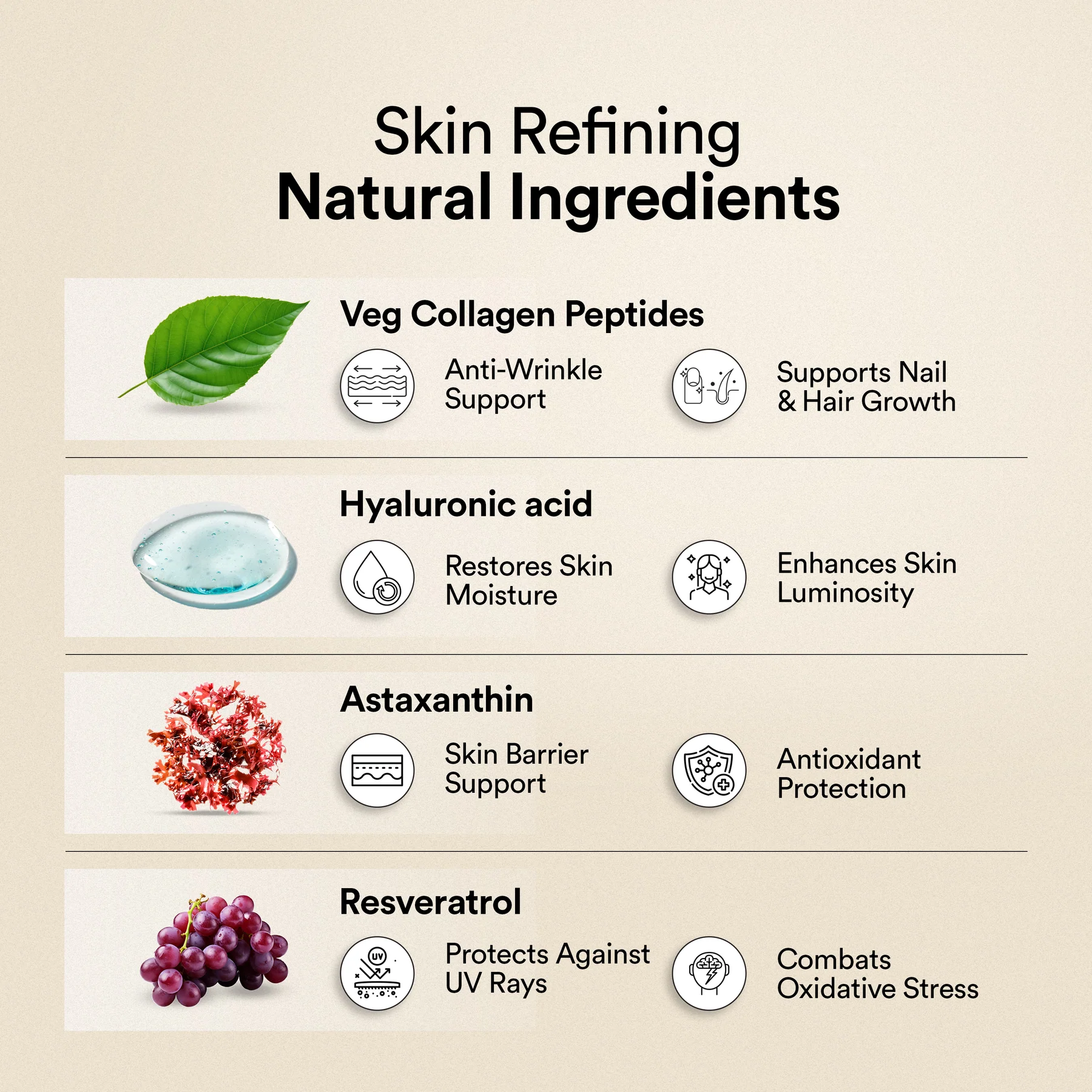 A new-age beauty solution featuring Vegetarian Collagen Peptides, carefully extracted from vegetables like broccoli and carrots, helps stimulate fibroblast cells, boosting natural collagen production. Each serving contains 5 grams of Type 1 & 3 vegan pro-collagen, Astaxanthin, Hyaluronic Acid, Resveratrol, with Vitamin C & E, providing anti-wrinkle support and reducing the signs of ageing.