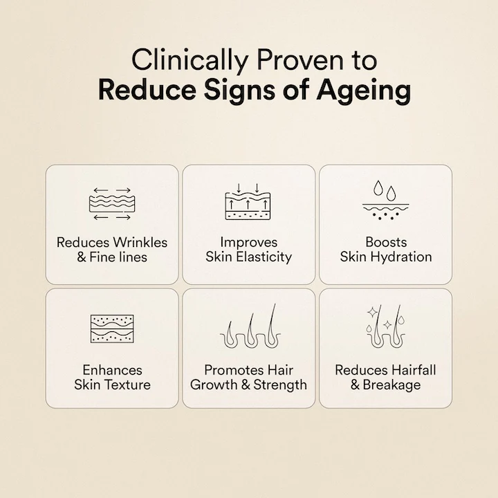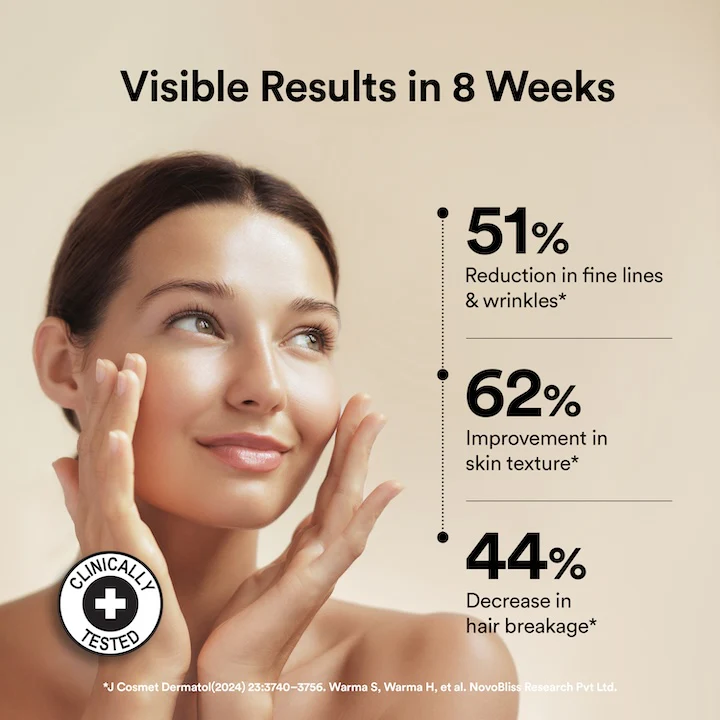 Enriched with clinically proven ingredients including Vitamin C & E, to support collagen production and improve skin elasticity, hair strength, and overall skin texture