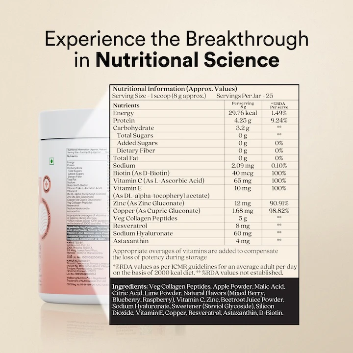 A new-age beauty solution featuring Vegetarian Collagen Peptides, carefully extracted from vegetables like broccoli and carrots, helps stimulate fibroblast cells, boosting natural collagen production. Each serving contains 5 grams of Type 1 & 3 vegan pro-collagen, Astaxanthin, Hyaluronic Acid, Resveratrol, with Vitamin C & E, providing anti-wrinkle support and reducing the signs of ageing.
