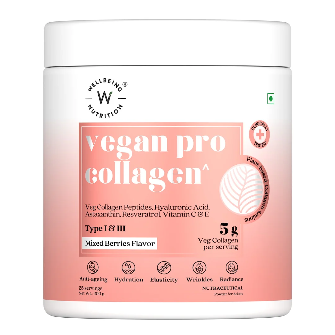 Wellbeing Nutrition’s Vegan Pro Collagen is formulated with a powerful blend of natural ingredients to boost collagen production. It features Vegetarian Collagen Peptides, Hyaluronic Acid, Astaxanthin, and Resveratrol, with vitamins C & E, clinically proven to help improve skin elasticity, texture, reduce wrinkles and improve overall hair health.