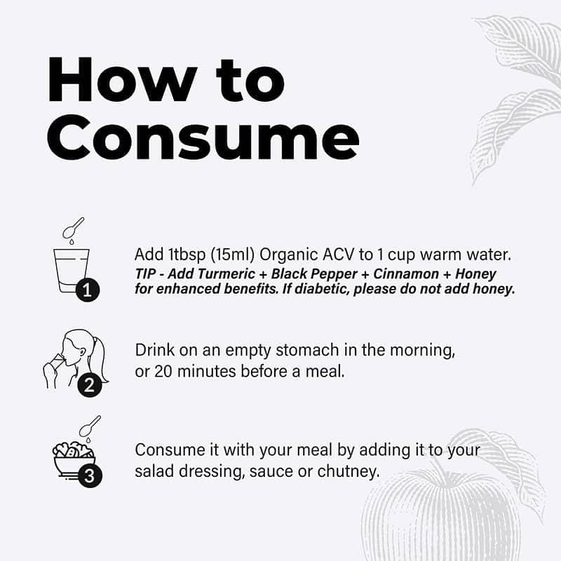 • Add 1tbsp (15 ml) Organic ACV to 1 cup of warm water.