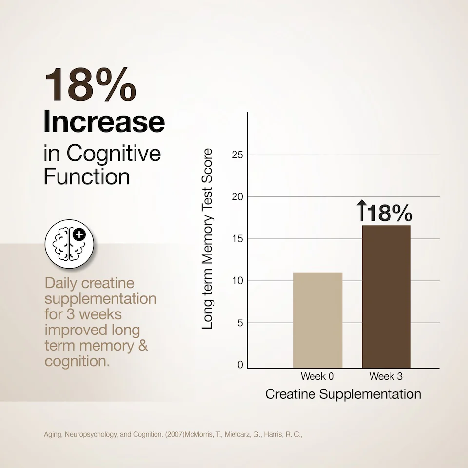 Beyond muscle health, creatine plays a role in brain energy metabolism, supporting better focus, mental clarity, and neuroprotection, especially under physical or cognitive stress.