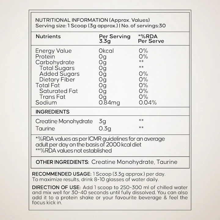 Our ultra-pure, micronized Creatine Monohydrate is carefully formulated for enhanced performance and rapid recovery. One of the most researched forms, our Creatine Monohydrate boosts muscle cell volume, builds lean muscle mass, fuels high-intensity workouts, and supports cognitive function. Each dose is formulated for optimal ATP energy, powering your body from workout to recovery with maximum efficiency and effectiveness. Enriched with 300 mg Taurine, a powerful amino sulfonic acid, it helps enhance muscle function, hydration, recovery & reduce fatigue. Creatine & Taurine work synergistically to help you push your limits and achieve peak performance.