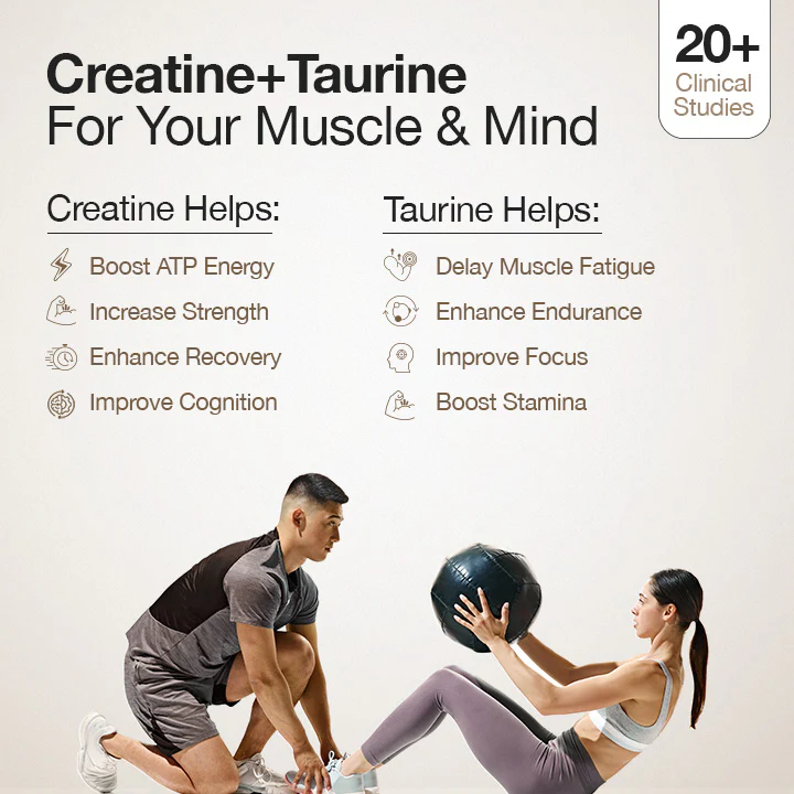 Taurine works synergistically with creatine to support muscle function, recovery, and electrolyte balance. It helps combat fatigue, protect muscle tissue, and promote faster post-workout repair.