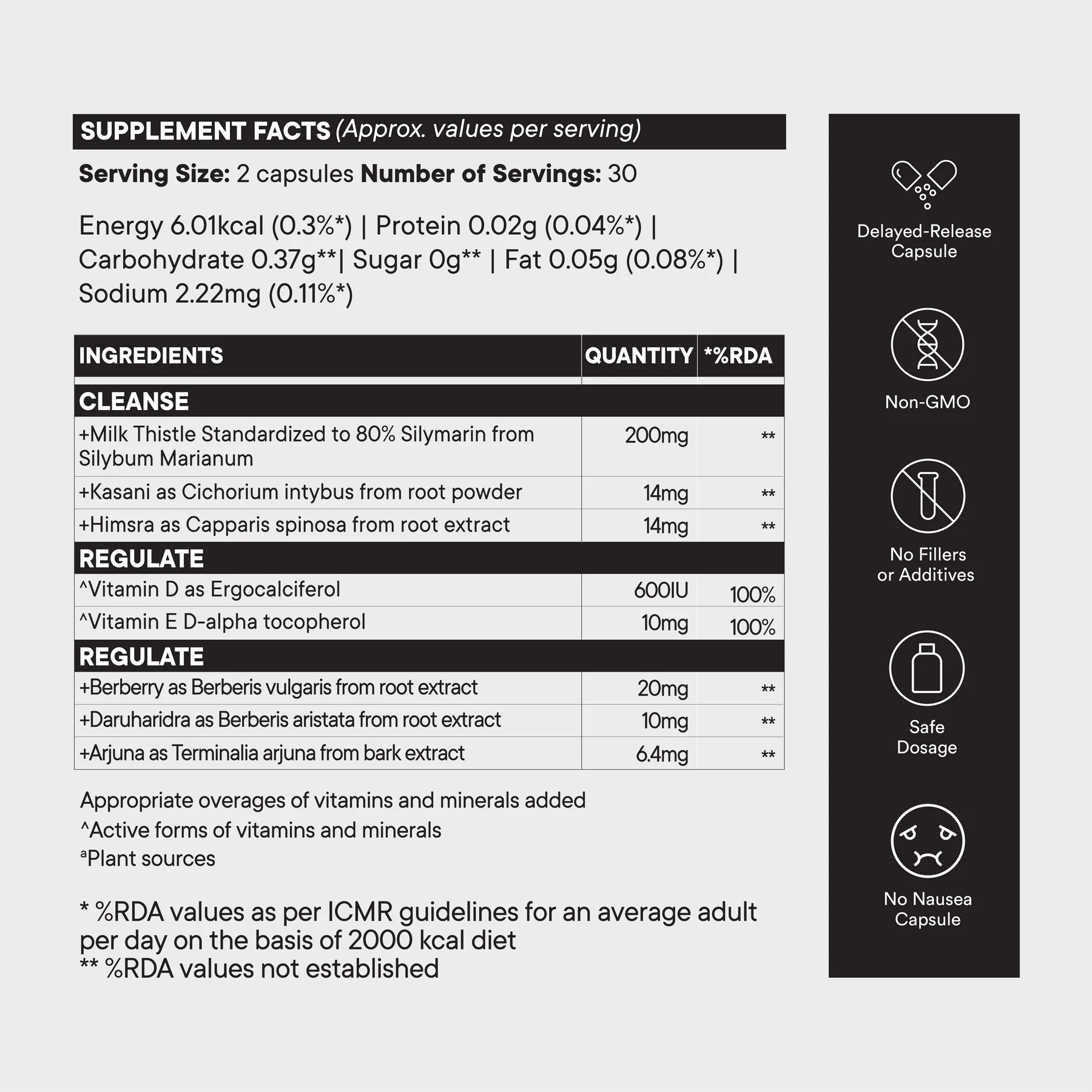 Revitalize your liver health with our research-backed formula featuring 6 organic adaptogenic herbal extracts including the highest grade of Milk Thistle (standardized to 80% Silymarin), Himsra, Berberry, Arjuna with vitamin D & E. Enteric-coated microbeadlets ensure timed release of nutrients for optimal results.