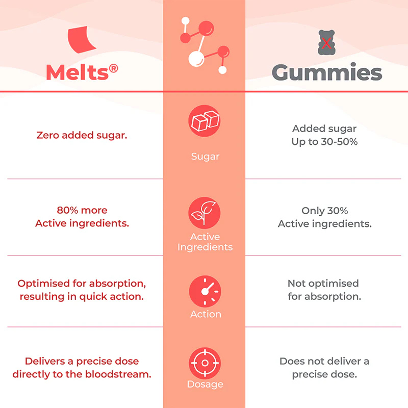 All your essential nutrients in one strip. Each melts®️ multivitamin contains 100% RDA for men and women to fill any nutritional gaps, support your well-being, and encourage a healthy, active lifestyle. A potent blend delivering Vitamins A, B-Complex, C, D3 & K2 and Ashwagandha and Ginseng.