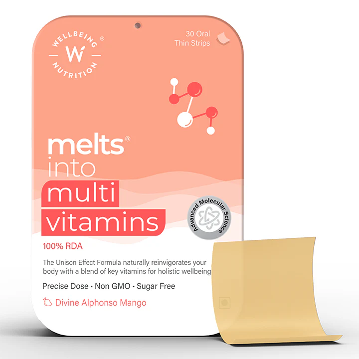 Wellbeing Nutrition’s melts® Multivitamins is formulated with a powerful blend of natural ingredients like VitaminB12, D3K2, KSM66, Ashwagandha, B complex, Vitamin C, Iron, and Zinc, all carefully selected to support immunity and boost overall health.