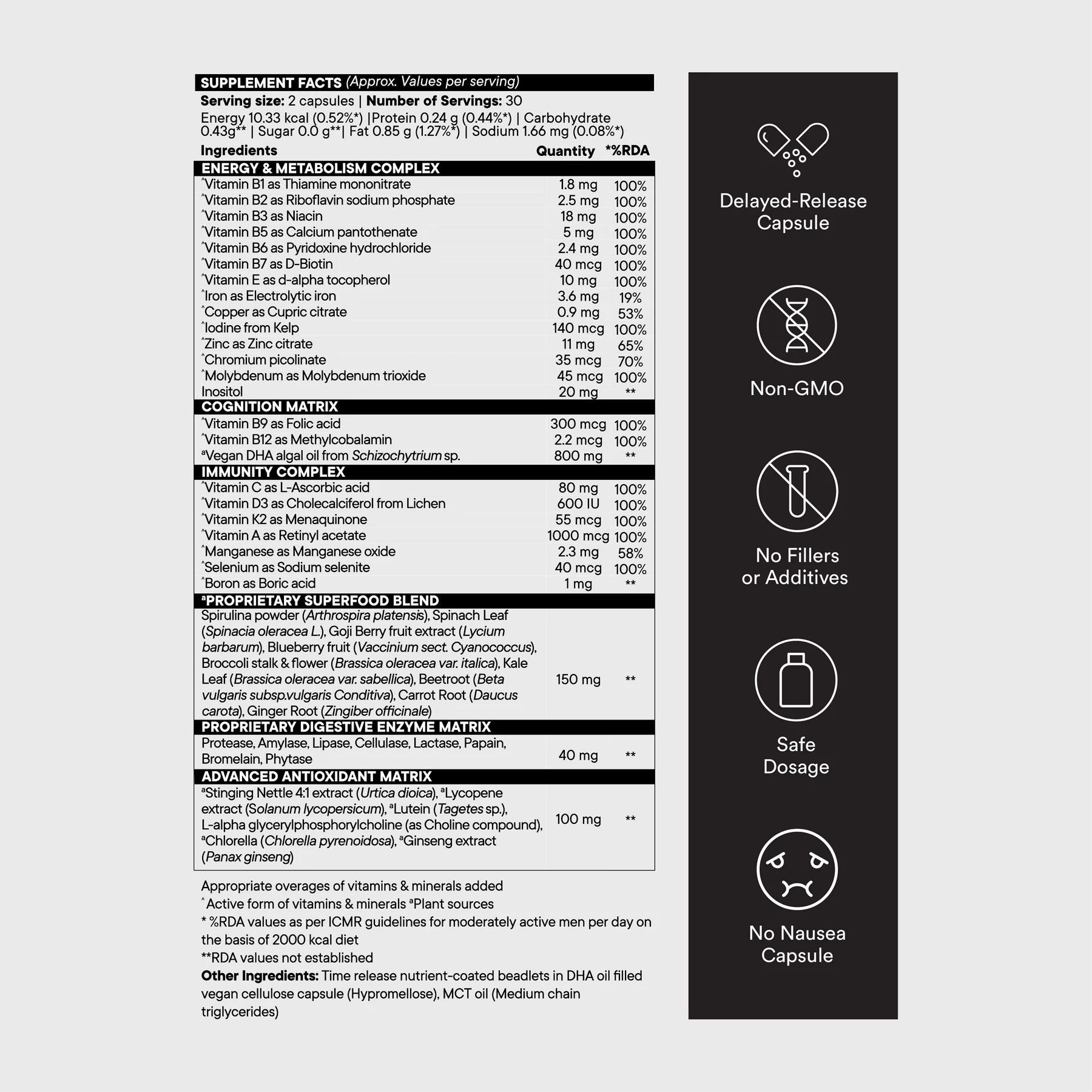 Unlock vitality with our scientifically formulated men’s multivitamin with 23 essential nutrients, superfoods, and vegan DHA Algal oil in a convenient capsule. Tailored for a busy lifestyle, the 8-hour time release technology supports optimum energy, immunity, cognition, and focus all day long.