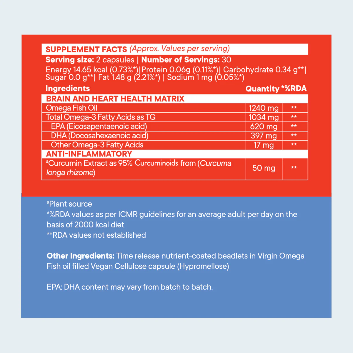 India’s Only curcumin-infused, 3x strength Omega-3 supplement with revolutionary 2-in-1 technology. Fast-absorbing oil and slow-release enteric-coated curcumin ensure the highest bioavailability. Packed with 620mg EPA and 397mg DHA, SLOW omega-3 capsules with fish oil boast of highest purity – 83% omega-3 fats in small capsules. Mint enhanced for a pleasant taste and third-party tested for heavy metals.