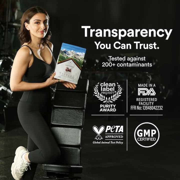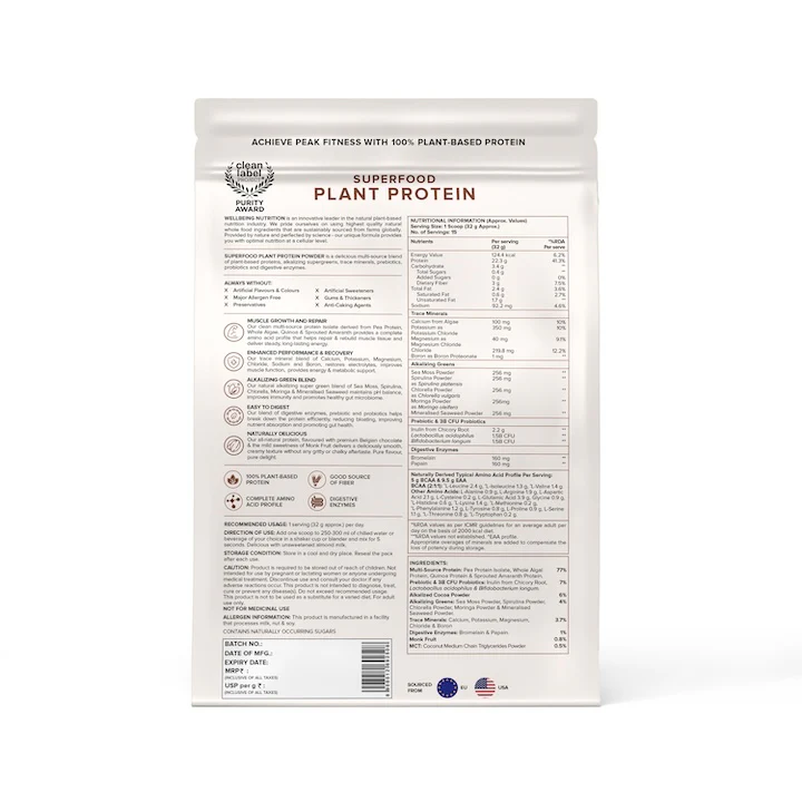 Our Belgian Dark Chocolate flavoured Plant Protein is a premium blend of pea protein isolate, quinoa, sprouted amaranth, and whole algae, enhanced with essential trace minerals like calcium, potassium, magnesium, chloride, and boron to support muscle performance, growth, and repair. The supergreen blend of sea moss, moringa, and spirulina helps maintain the body’s pH balance, while prebiotics from inulin as chicory root, probiotics featuring Lactobacillus acidophilus and Bifidobacterium longum, and digestive enzymes bromelain and papain work together to improve overall gut health.