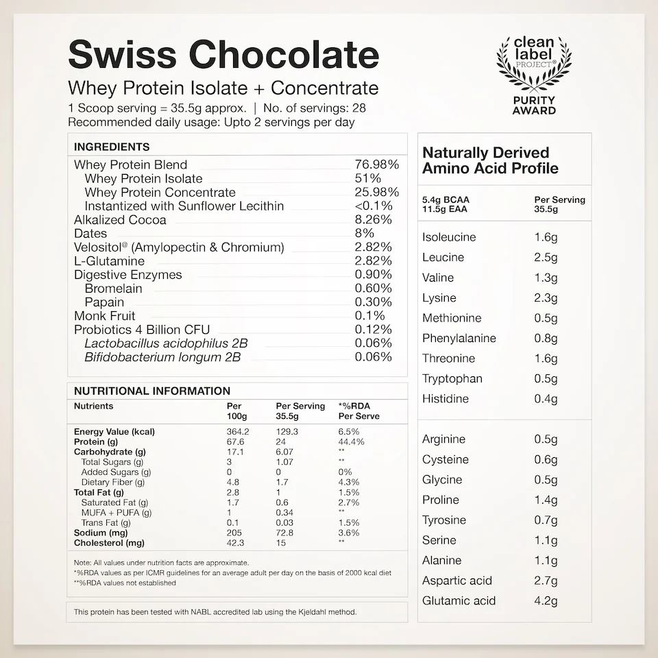 Introducing India’s first Whey protein isolate & concentrate blend with Velositol®, clinically proven to improve muscle strength & endurance in 8 weeks. Our ultra-pure, fast-absorbing Whey protein delivers 24 g protein, 11.5 g EAA, 5.4 g BCAA & 1 g Glutamine with 4 Billion CFU of probiotics & digestive enzymes for a gut-friendly dose of goodness without any bloating. Sweetened with zero-calorie monk fruit, our decadent Swiss chocolate-flavoured whey protein blend is instantized for a smooth, light texture, perfect for fueling workouts, recovery, and daily nutrition.